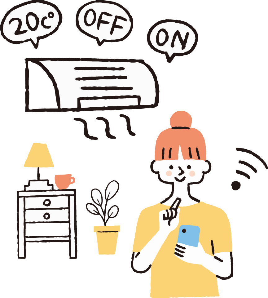 家の中の家電や設備をインターネットにつなげて、スマートフォンで一括管理。照明・エアコン・玄関ドア等、指先ひとつでコントロールできます。外出先からでも操作できるから、「帰ったら部屋が涼しい」「鍵の閉め忘れも確認できて安心」など、毎日の暮らしがぐっと快適になります。